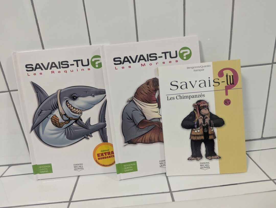 La collection Savais-tu ? de Michel Quintin sur les animaux est vraiment génial pour les enfants de 7 ans et plus. Je trouve que ce sont de premières lectures, premières bandes dessinées parfaites pour en apprendre plus tout en rigolant avec les faits inusités qu’on apprend et les illustrations très drôles de Sampar.